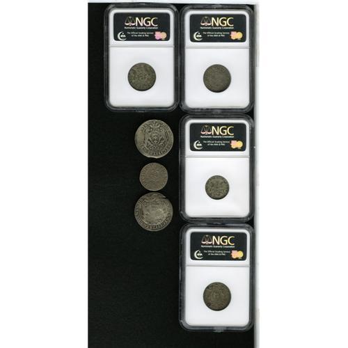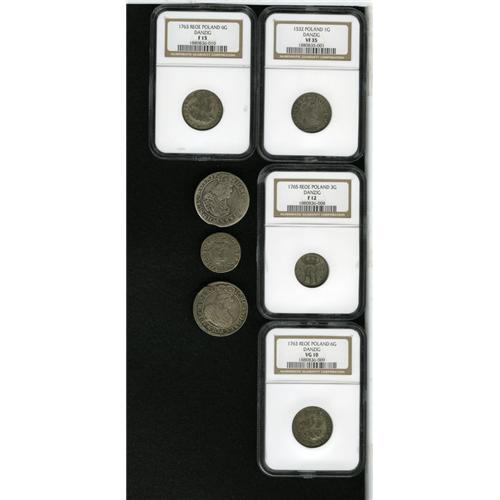 <B>Danzig. Assortment of Silver Types, </B></I>Sigismund (2) Grosze 1530, Fine, porous surface, and 1532 VF35 NGC, Johann Casimir (2) 18 Groszy 1660, crude VF, edge cut, and 1662, Fine, and August III 3 Groszy 1765 REOE, F12 NGC, and 6 Groszy 1763 REOE (2), VG10 NGC and F15 NGC. <B>Sold as is, no return lot.</B></I><BR><BR><b>Shipping:</b> Coin/Currency (<a target="_blank" href="http://www.heritageauctions.com/common/shipping.php">view shipping information</a>)