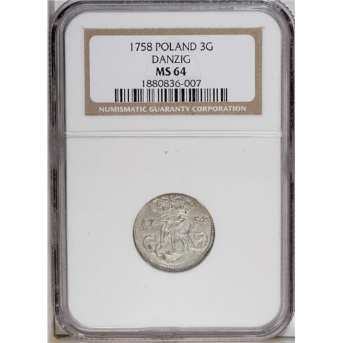 <B>Danzig. August III 3 Grosze 1758, </B></I>KM104, MS64 NGC, a fully brilliant example of this billon type - very rarely seen in this quality.<BR><BR><b>Shipping:</b> Coin/Currency (<a target="_blank" href="http://www.heritageauctions.com/common/shipping.php">view shipping information</a>)