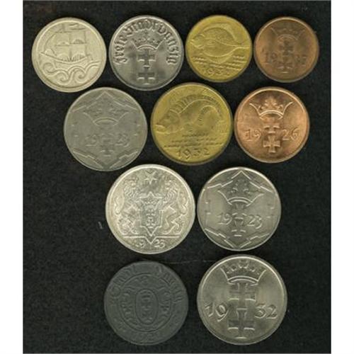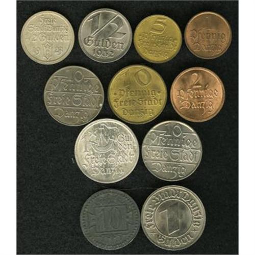 <B>Free City - Choice Selection,</B></I> eleven examples featuring: Pfennig 1937, 2 Pfennig 1926, 10 Pfennig 1923 (2), 5 Pfennig 1932, 10 Pfennig 1932, 1/2 Gulden 1923, Gulden 1923, 1/2 Gulden 1932, Gulden 1932 and 10 Pfennig 1920 small 10. Should be carefully viewed, but most coins are UNC. <B>Sold as is, no return lot.</B></I><BR><I>From the Robert Sayre Collection.</B></I><BR><BR><b>Shipping:</b> Coins & Currency (<a target="_blank" href="http://www.heritageauctions.com/common/shipping.php">view shipping information</a>)