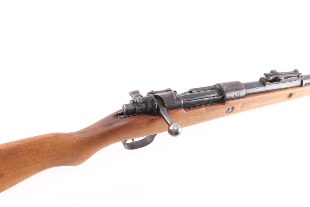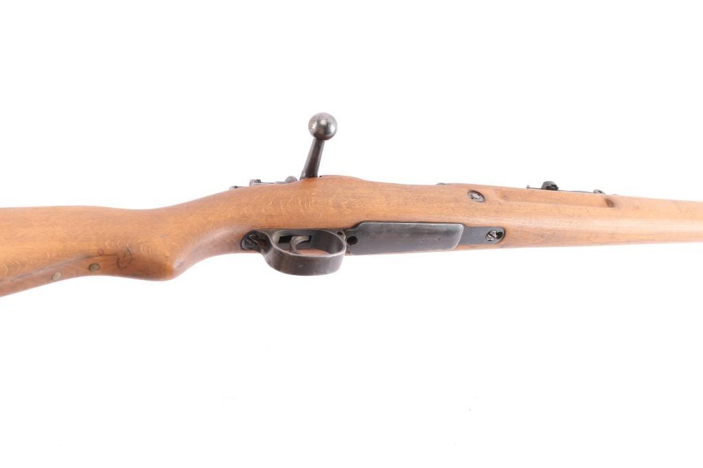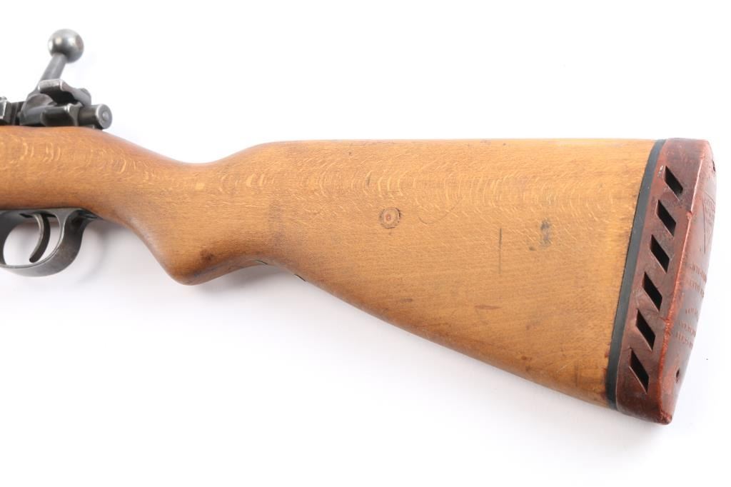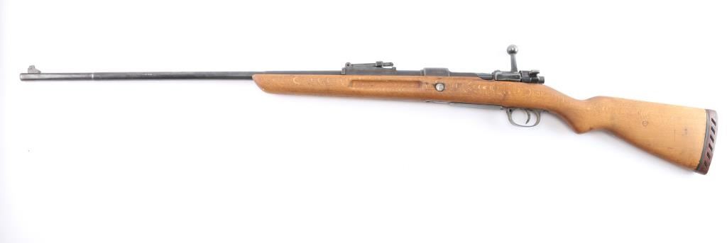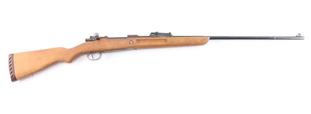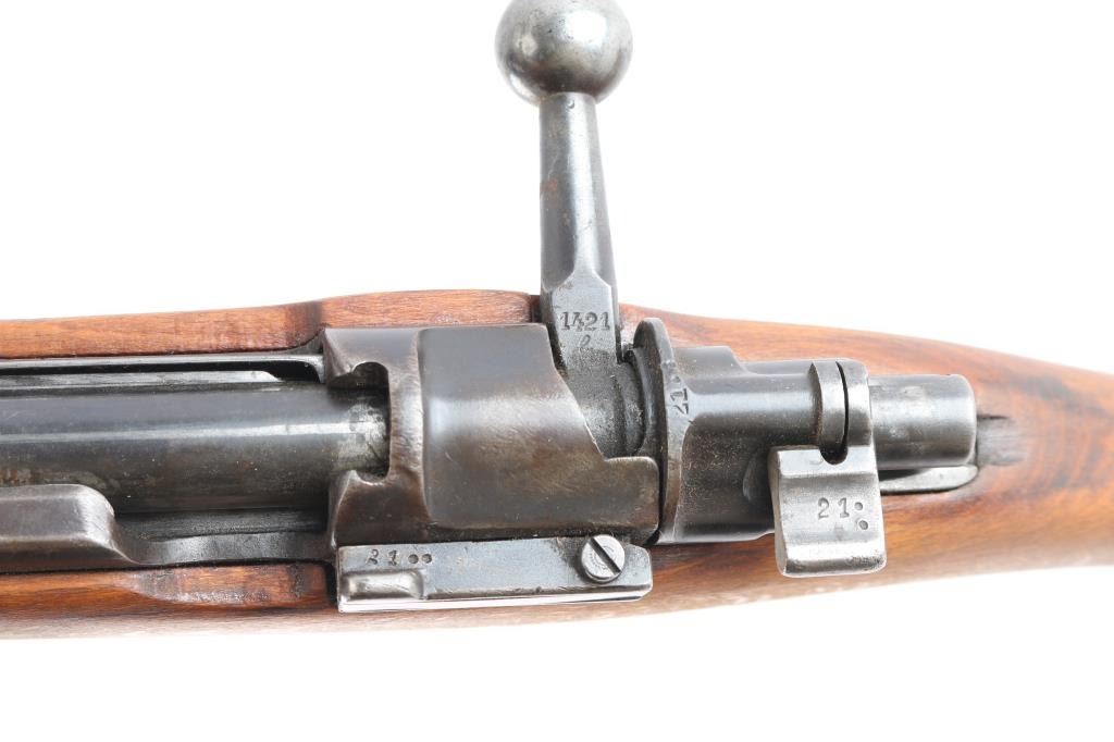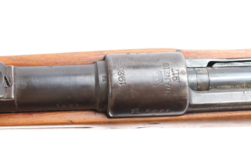 This is a German WW1 infantry rifle that has been sporterized. Chamber dated 1917 with the 1920 date above. The 1920 is the mark that indicates this is one of the rifles "officially" taken over by the Reichswehr. The barrel, receiver and bolt have matching serial numbers, triggerguard and floorplate are mismatched. The stock has been sanded, forearm shortened, handguards removed and rubber recoil pad installed. Action works well, blue is about 75% with handling wear on the bottom metal, receiver and bolt knob, wood is sound and the bore is good, strong rifling, lightly frosted.
