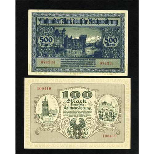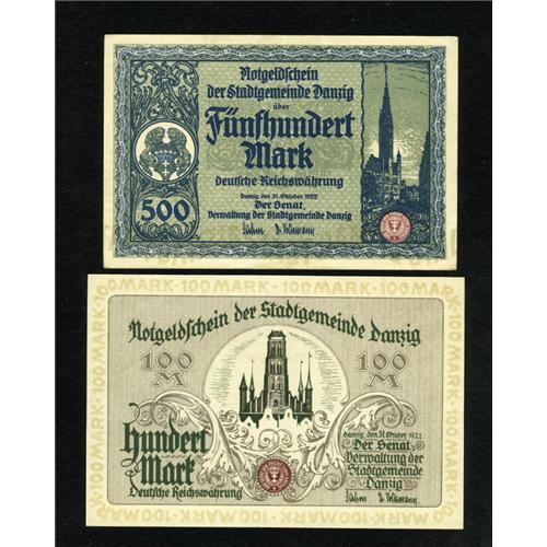 <B>Danzig Inflation Papermoney, </B></I>Pick 13 100 Mark 31-10-1922, UNC, and Pick 14 500 Mark 31-10-1922, crisp XF-AU, one center fold. Both issues are quite scarce.<BR><BR><b>Shipping:</b> Coin/Currency (<a target="_blank" href="http://www.heritageauctions.com/common/shipping.php">view shipping information</a>)