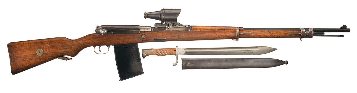 This is an example of a Danzig GEW 98 rifle equipped with the unique Zeiss 2.5 power sighting system, extended 25 round magazine and dust cover. This sighting system was developed primarily for use in marginal light and is easily attached to any standard rear sight of the GEW 98. The system was accompanied by a folding luminous front sight which is absent on this rifle. The magazine greatly increased the cartridge capacity, however was extremely difficult to handle which made it unpopular with the German troops. The top of the receiver ring is marked "Crown / DANZIG / 1916", the right side is marked with crown over Gothic letter proofs and the left side is marked with the serial number and the Imperial eagle. The scope is marked with the Carl Zeiss logo in two places, "No4870" and "2.5x". Standard front and rear sights with the graduation markings on each side of the barrel below the rear sight. The blue magazine is equipped with the cut off attached by a chain and a dust cover has been installed on the bolt. Mounted with a one piece full length pistol grip stock with crown proof on the wrist and the serial number struck (5096) and arsenal restamped "44" to match. The bolt has had the numbers struck twice and then numbered 44 to match the receiver. Complete with slotted cleaning rod and Alex Cooper marked bayonet with serrated wooden handle and metal scabbard.