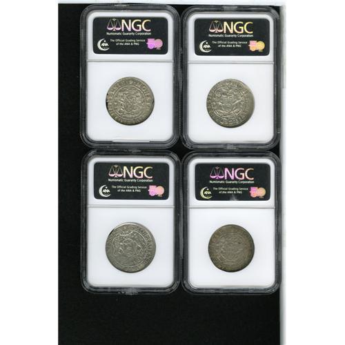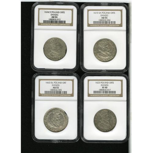 <B>Danzig. NGC Certified 1/4 Talars, </B></I>Sigismund III KM6 1615-SA AU55, KM15 1623 XF40, 1624/3 AU53 and Johann Casimir KM54 1663-DL AU55. <B>Sold as is, no return lot.</B></I><BR><BR><b>Shipping:</b> Coin/Currency (<a target="_blank" href="http://www.heritageauctions.com/common/shipping.php">view shipping information</a>)