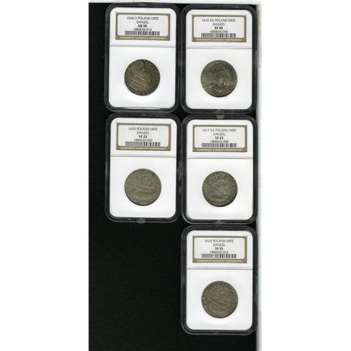 <B>Danzig. NGC Certified Sigismund III 1/4 Talars, </B></I>five examples featuring: 1616-SA XF40, 1617-SA VF25, 1623 VF35, 1624/3 AU50 and 1625 VF25. <B>Sold as is, no return lot.</B></I><BR><BR><b>Shipping:</b> Coin/Currency (<a target="_blank" href="http://www.heritageauctions.com/common/shipping.php">view shipping information</a>)