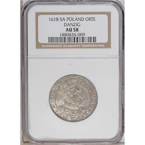 <B>Danzig. Sigismund III 1/4 Talar (Ort) 1618-SA, </B></I>KM14, plain collar, AU58 NGC, razor sharp details and attractive old-time toning.<BR><BR><b>Shipping:</b> Coin/Currency (<a target="_blank" href="http://www.heritageauctions.com/common/shipping.php">view shipping information</a>)