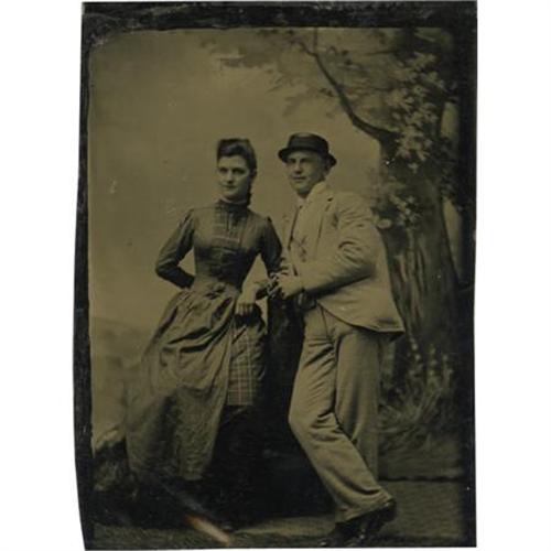 <B>Dapper Young Couple 1/6th Plate Tintype.</B></I> 1/6th plate (2.5” x 3.5”), clear, sharp image with a slight bend at the lower left corner, else near fine. A finely dressed couple posed casually standing against a studio backdrop. <I>Ex. Henry E. Luhrs Collection.</B></I> <BR><BR><b>Shipping:</b> Flat Material, Small (<a target="_blank" href="http://www.heritageauctions.com/common/shipping.php">view shipping information</a>)