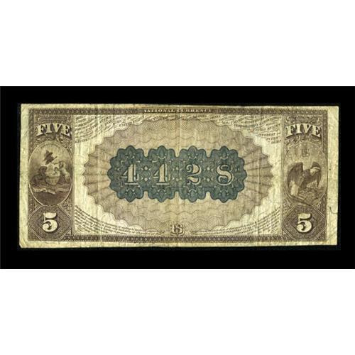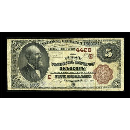 <B>Darby, PA</B></I> - $5 1882 Brown Back Fr. 471 <B>The First NB</B></I> Ch. # (E)4428<BR> This piece boasts a lot of life for just a Fine grade. Previously unreported, this piece brings the census of Brown Backs on this bank to five, though we do not have record of a such an example ever crossing the auction block before this evening. <B>Fine-Very Fine.</B></I><BR><BR><b>Shipping:</b> Coins & Currency (<a target="_blank" href="http://www.heritageauctions.com/common/shipping.php">view shipping information</a>)