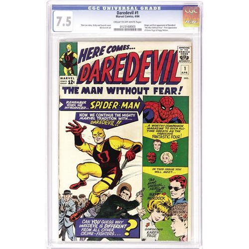 <B>Daredevil #1 (Marvel, 1964) CGC VF- 7.5 Cream to off-white pages.</B></I> One of the final new titles introduced during the first phase of the Marvel Age, the title featured a unique superhero and a distinctive look compared to the other titles introduced since Fantastic Four some 2 1/2 years earlier. Jack Kirby and the equally venerable Bill Everett teamed up for the cover art, with Everett also providing interior art. Featured were the origin and first appearance of Daredevil, and the first appearances of Karen Page and Foggy Nelson. Overstreet 2006 VF 8.0 value = $2,065. CGC census 7/06: 39 in 7.5, 140 higher. <BR><BR><B>Important notice:</B> Heritage usually auctions material at the rate of 200-250 lots per hour. On some occasions eBay Live bid software or the Internet may not be able to keep up with the pace of the auction. We recommend placing a realistic absentee bid now as insurance to avoid disappointment. Occasionally the auctioneer may eliminate or reject an eBay Live bid, and the auctioneer may also reopen a lot after the close of the eBay live bidding (usually because we missed an audience bid), and may reject your bid even if it shows you as the winning bidder. By bidding via eBay Live, you agree that Heritage may award the lot to another bidder at its sole discretion under the circumstances described above or any other reasonable circumstances. Since eBay bids are not shown to us until we open the lot on the floor, we treat those bids just like floor bids. In most cases the floor responds before the eBay bid is presented to us, due to Internet lag time, so for consistency we have made it a policy that floor bids are always considered first over tie eBay live bids. Also please note that all Heritage lots purchased through eBay Live carry a 22.5% Buyer's Premium. Please make sure you read the Terms and Conditions before you bid. This lot is being auctioned in conjunction with a live floor auction by Heritage Auction Galleries. All final auction and invoice information will be supplied by Heritage Auction Galleries, and all other information should be considered preliminary. Lot:41001 <BR><BR><B>Winning Notification and Billing:</B> After the FINAL session in this auction is complete, Heritage will send e-mail and snail mail invoices. This process normally takes several days. All final auction and invoice information will be supplied by Heritage Auction Galleries, and all other information should be considered preliminary. <BR><BR>This auction will be conducted on a live auction floor and over the Internet through eBay Live. If you choose to place an absentee bid, please take a moment to <font color='#0000ff'><u><a href='http://pages.ebay.com/liveauctions/help/before/laabsentee.html'>learn how eBay Live absentee bidding works</a></u></font><font color='#000000'>