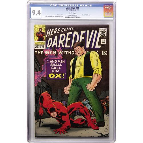 <B>Daredevil #15 (Marvel, 1966) CGC NM 9.4 White pages.</B></I> The only previous 9.4 copies we had seen lacked this one's "white" pages! John Romita Sr. drew this issue, including the cover. Overstreet 2006 NM- 9.2 value = $150. CGC census 3/07: 20 in 9.4, 9 higher.<BR><BR><b>Shipping:</b> Comics - Slabbed (certified) (<a target="_blank" href="http://www.heritageauctions.com/common/shipping.php">view shipping information</a>)