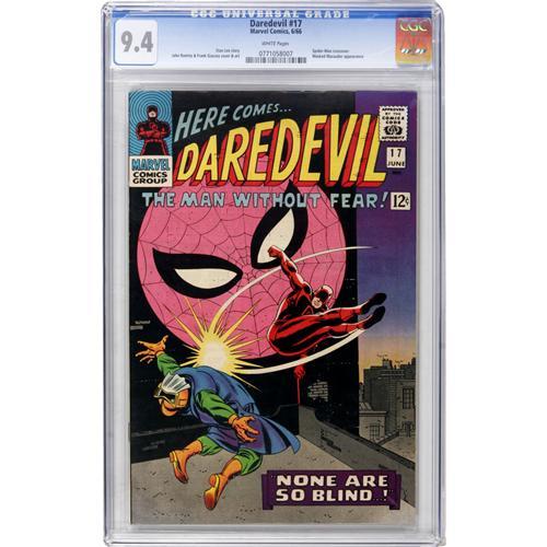 <B>Daredevil #17 (Marvel, 1966) CGC NM 9.4 White pages.</B></I> The Masked Marauder takes on both Daredevil and Spidey in this crossover issue. John Romita Sr. and Frank Giacoia provide the cover and art for this ish. Overstreet 2006 NM- 9.2 value = $225. CGC census 3/07: 15 in 9.4, 6 higher.<BR><BR><b>Shipping:</b> Comics - Slabbed (certified) (<a target="_blank" href="http://www.heritageauctions.com/common/shipping.php">view shipping information</a>)