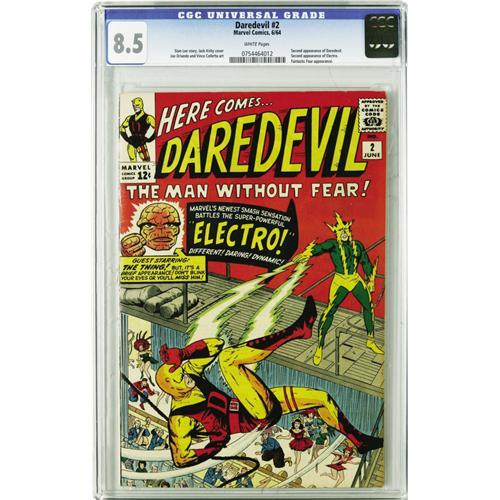 <B>Daredevil #2 (Marvel, 1964) CGC VF+ 8.5 White pages.</B></I> Daredevil's second appearance has the Man Without Fear battling Electro. Meanwhile, the Fantastic Four put in a brief appearance, and they're looking for a lawyer, any lawyer... if you guessed that they happen to pick Matt Murdock, go to the head of the class! Joe Orlando handled the interior art, and the cover is credited to none other than Jack Kirby. Overstreet 2006 VF 8.0 value = $578; VF/NM 9.0 value = $964. CGC census 3/06: 14 in 8.5, 44 higher.