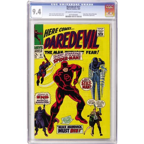 <B>Daredevil #27 (Marvel, 1967) CGC NM 9.4 Off-white to white pages.</B></I> Spider-Man appearance. Gene Colan cover. Overstreet 2006 NM- 9.2 value = $90. CGC census 3/07: 16 in 9.4, 8 higher.<BR><BR><b>Shipping:</b> Comics - Slabbed (certified) (<a target="_blank" href="http://www.heritageauctions.com/common/shipping.php">view shipping information</a>)
