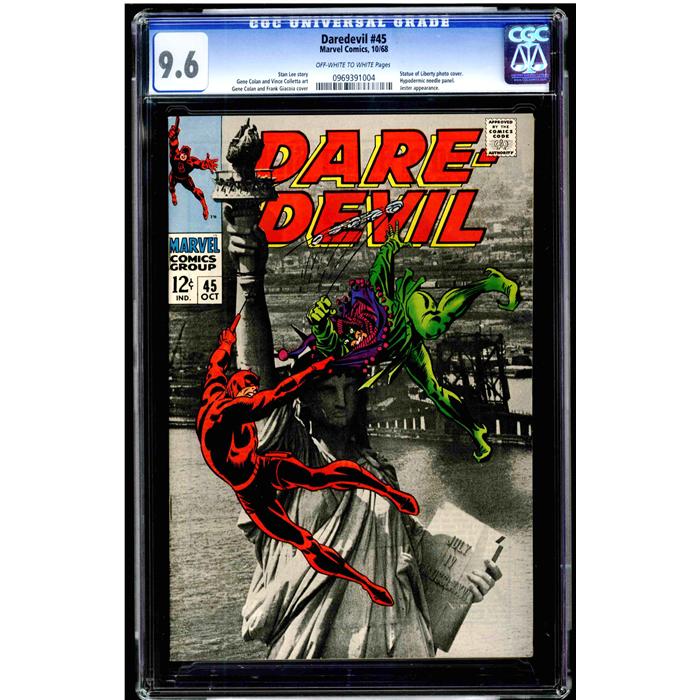 Daredevil #45 CGC 9.6 off-white to white pages. Stan Lee story, Gene Colan and Vince Colletta art, Gene Colan and Frank Giacoia cover. Hypodermic needle panel. Jester appearance. Statue of Liberty photo cover. Overstreet 2009 NM 9.2 value = $65. CGC census: 19 at 9.6, 5 higher