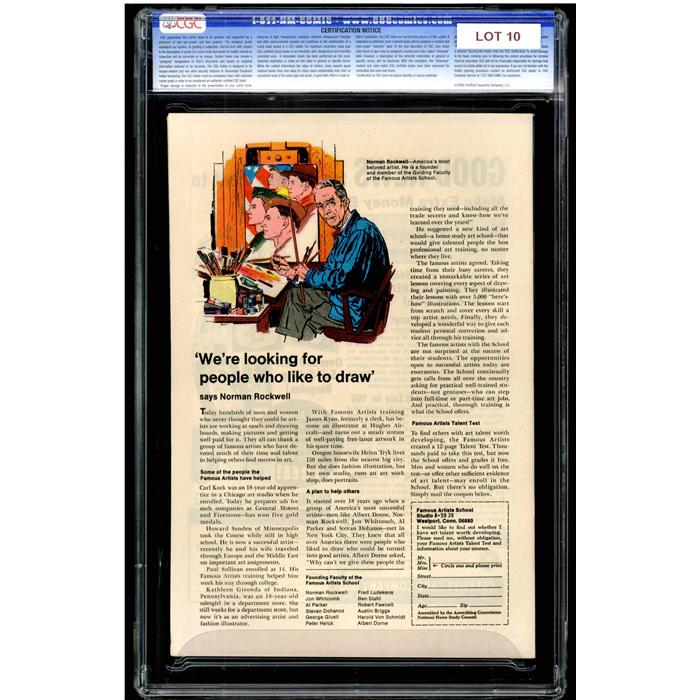 The Auctioneer has reserved the right to reject any and all bids, and to bid at the auction. Auctioneers Auctions are not on approval. Auctioneer does not allow certified material to be returned because of possible differences of opinion with respect to the grade offered by any third party organization, dealer, or service. Absolutely no guarantee of grade is offered for un-certified property sold and subsequently submitted to a third-party grading service. There will be no exceptions to this policy. Under extremely limited circumstances, (e.g. gross cataloging error) a purchaser, who did not bid from the floor, may request Auctioneer to evaluate voiding a sale; such request must be made in writing detailing the alleged gross error, and submission of the lot to the Auctioneer must be pre-approved by the Auctioneer. Bidder must notify Auctioneer in writing of such request within three (3) days of the non-floor bidder receipt of the lot. Any lot that is to be evaluated must be in our offices within 30 days after Auction. Grading does not qualify for this evaluation process nor do such complaints constitute a basis to challenge the authenticity of a lot. AFTER THAT 30-DAY PERIOD, NO LOTS MAY BE RETURNED FOR REASONS OTHER THAN AUTHENTICITY. Lots returned must be housed intact in the original holder. No lots purchased by floor Bidders may be returned (including those Bidders acting as agents for others). Late remittance for purchases may be considered just cause to revoke all return privileges. B: Auctions conducted solely on the Internet have a THREE (3) DAY RETURN POLICY: Lots paid for within seven days of the Auction closing are sold with a three (3) day return privilege. You may return lots under the following conditions: Within three days of receipt of the lot, you must first notify Auctioneer by contacting Client Service by phone (314-680-8599) or e-mail (moundcityauctions@gmail.com), and immediately mail the lot(s) fully insured to the attention of Returns, Mound City Auctions 1081 Teson Rd. Hazelwood, MO. 63042. Lots must be housed intact in their original holder and in their original condition. You are responsible for the insured, safe delivery of any lots. Auctioneer will not be responsible for lots returned in non-registered mail or lots returned without prior authorization per section B. A non-negotiable return fee of 5% of the purchase price ($10 per lot minimum) will be deducted from the refund for each returned lot or billed directly. Postage and handling fees are not refunded. After the three-day period (from receipt), no items may be returned for any reason. Late remittance for purchases revokes all Return-Restock privileges. C: Bidders who have inspected the lots prior to the auction will not be granted any return privileges. D: Comic books sold referencing a third-party grading service are sold “as is” without any express or implied warranty. Certain warranties may be available from the grading services and the Bidder is referred to them for further details: Certified Guaranty Company, LLC. (CGC), P.O. Box 4738, Sarasota, FL 34230. E: Bidders who intend to challenge authenticity or provenance of a lot must notify Auctioneer in writing within thirty (30) days of the Auctions conclusion. In the event Auctioneer cannot deliver the lot or subsequently it is established that the lot lacks title, provenance, authenticity, or other transfer or condition issue is claimed, Auctioneer's liability shall be limited to rescission of sale and refund of purchase price; in no case shall Auctioneer's maximum liability exceed the high bid on that lot, which bid shall be deemed for all purposes the value of the lot. After one year has elapsed, Auctioneer's maximum liability shall be limited to any commissions and fees Auctioneer earned on that lot. F: All comics are guaranteed genuine, but are not guaranteed as to grade, since grading is a matter of opinion, an art and not a science, and therefore the opinion rendered by the Auctioneer or any third party grading service may not agree with the opinion of others (including trained experts), and the same expert may not grade the same item with the same grade at two different times. G: Since we cannot examine encapsulated comics, they are sold “as is”without our grading opinion, and may not be returned for any reason. Auctioneer shall not be liable for any patent or latent defect or controversy pertaining to or arising from any encapsulated collectible. In any such instance, purchaser's remedy, if any, shall be solely against the service certifying the collectible. H: Due to changing grading standards over time, differing interpretations, and to possible mishandling of items by subsequent owners, Auctioneer reserves the right to grade items differently than shown on certificates from any grading service that accompany the items. Auctioneer also reserves the right to grade items differently than the grades shown in the prior catalog should such items be reconsigned to any future auction. I: Although consensus grading is employed by most grading services, it should be noted as aforesaid that grading is not an exact science. In fact, it is entirely possible that if a lot is broken out of a plastic holder and resubmitted to another grading service or even to the same service, the lot could come back with a different grade assigned. J: Certification does not guarantee protection against the normal risks associated with potentially volatile markets. The degree of liquidity for certified collectibles will vary according to general market conditions and the particular lot involved. For some lots there may be no active market at all at certain points in time."
