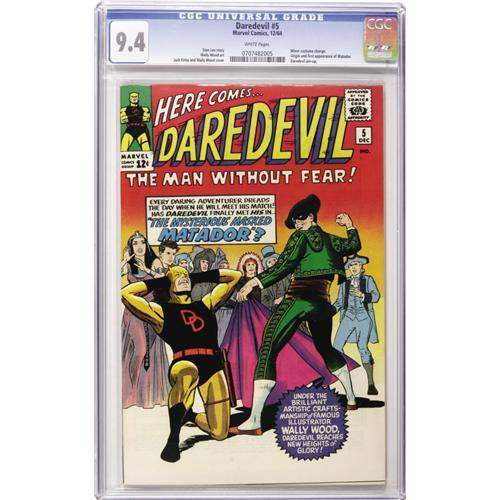 <B>Daredevil #5 (Marvel, 1964) CGC NM 9.4 White pages.</B></I> Wally Wood's first issue as artist of this title saw a costume change for the Man Without Fear: the D on his chest became a DD. Note the excellent page quality on this one! Overstreet 2006 NM- 9.2 value = $450. CGC census 9/06: 13 in 9.4, 4 higher.<BR><BR><b>Shipping:</b> Slabbed Comic (<a target="_blank" href="http://www.heritageauctions.com/common/shipping.php">view shipping information</a>)