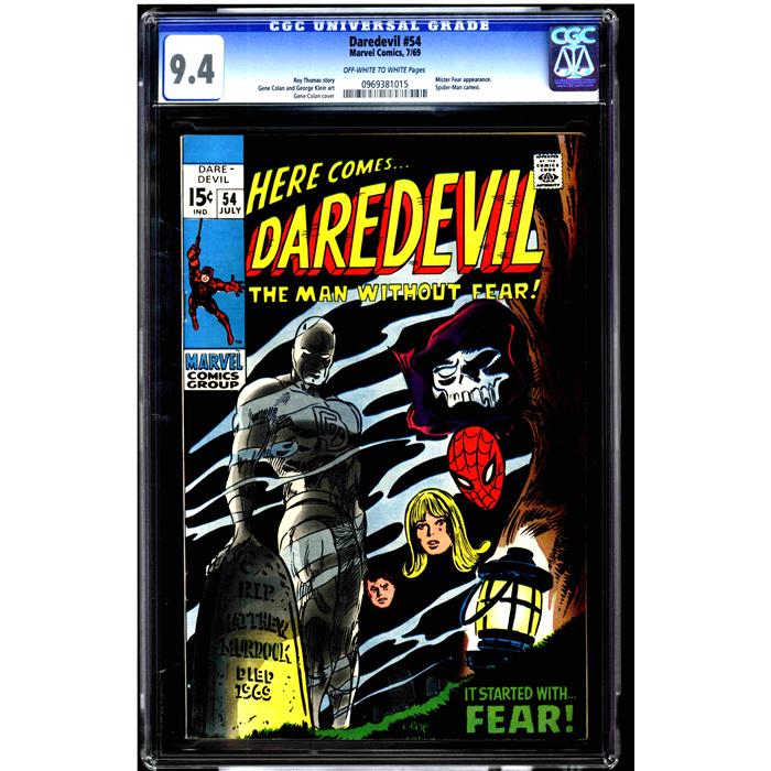 Daredevil #54 CGC 9.4 off-white to white. Roy Thomas story Gene Colan and George Klein art Gene Colan cover Spider-Man cameo. Mister Fear appearance. Overstreet 2009 average for NM 9.2 = $42. The CGC universal census reports 10 at 9.4, 3 higher.