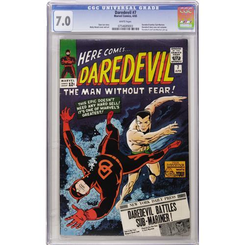 <B>Daredevil #7 (Marvel, 1965) CGC FN/VF 7.0 White pages.</B></I> The first appearance of Daredevil's red costume is featured and DD battles the Sub-Mariner. A Wally Wood cover and art and a Daredevil pin-up seal the deal on this Silver Age key. Overstreet 2006 FN 6.0 value = $189; VF 8.0 value = $536. CGC census 9/06: 29 in 7.0, 99 higher.<BR><BR><b>Shipping:</b> Slabbed Comic (<a target="_blank" href="http://www.heritageauctions.com/common/shipping.php">view shipping information</a>)
