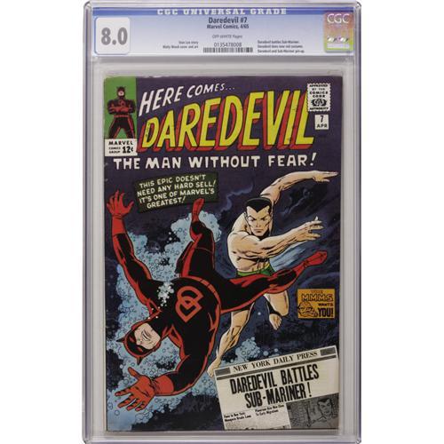 <B>Daredevil #7 (Marvel, 1965) CGC VF 8.0 Off-white pages.</B></I> This issue is the third most valuable in the entire run (and just shy of #2 for second place) owing to The Man Without Fear's tussle with the Sub-Mariner and also to his donning a new red costume for the first time. Wally Wood's cover and story art is featured. Overstreet 2006 VF 8.0 value = $536. CGC census 9/06: 28 in 8.0, 47 higher.<BR><BR><b>Shipping:</b> Slabbed Comic (<a target="_blank" href="http://www.heritageauctions.com/common/shipping.php">view shipping information</a>)