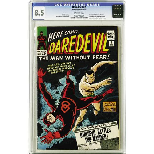 <B>Daredevil #7 (Marvel, 1965) CGC VF+ 8.5 Off-white pages.</B></I> This book has taken a big jump in Guide value in the last couple of years, and it's gone from being "just another early issue" to being arguably the most sought-after issue other than #1. And rightly so, we say, since it's got the first appearance of Daredevil's red costume. It certainly doesn't hurt that DD battles the Sub-Mariner, nor that the great Wally Wood furnished the cover and interior art. Overstreet 2006 VF 8.0 value = $536; VF/NM 9.0 value = $898. CGC census 3/06: 21 in 8.5, 23 higher.