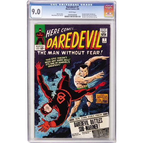 <B>Daredevil #7 (Marvel, 1965) CGC VF/NM 9.0 White pages.</B></I> You'd think a Silver Age book in VF/NM wouldn't be too hard to find, but we seldom encounter this issue above VF, perhaps because of the dark cover. It's a key book too, the first appearance of Daredevil's red costume as drawn by the great Wally Wood. Overstreet 2006 VF/NM 9.0 value = $898; NM- 9.2 value = $1,260. CGC census 3/07: 13 in 9.0, 10 higher. <I> From the Janowicz Collection.</B></I><BR><BR><b>Shipping:</b> Comics - Slabbed (certified) (<a target="_blank" href="http://www.heritageauctions.com/common/shipping.php">view shipping information</a>)