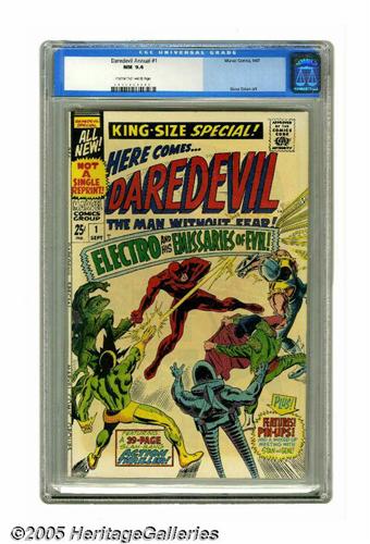 <B>Daredevil Annual #1 (Marvel, 1967) CGC NM 9.4 Cream to off-white pages.</B></I> Ol' Hornhead finds himself surrounded by a horde of his archfoes on this cover by Gene Colan. This extra-large issue also features pin-ups, new stories, and new art. Overstreet 2005 NM- 9.2 value = $70. CGC census 7/05: 18 in 9.4, 9 higher.