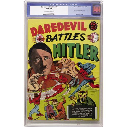 <B>Daredevil Comics #1 Daredevil Battles Hitler (Lev Gleason, 1941) CGC NM 9.4 Cream to off-white pages.</B></I> Here's an opportunity that'll be tough to beat: the chance to acquire the copy that's tied with the Mile High for the highest grade CGC has assigned, without having to pay the extra premium that the very name "Mile High" carries with it. Bob Wood and Charles Biro were the artists who produced a classic cover by retouching Hitler's face into a silly expression and drawing in his foes, namely the entire cast of <B>Silver Streak Comics</B></I> (the two creators combined their names for the signature "Woodro"). The spiky-belted Daredevil also appeared in a second story, battling the fictional (yet fearsome) Claw. The book brings a smile to any fan's face, and owning this NM specimen would certainly bring a smile to yours! Overstreet 2006 NM- 9.2 value = $21,500. CGC census 10/06: 2 in 9.4, none higher.<BR><BR><b>Shipping:</b> Slabbed Comic (<a target="_blank" href="http://www.heritageauctions.com/common/shipping.php">view shipping information</a>)