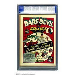 Daredevil Comics #1 (Lev Gleason, 1941) CGC NM 9.4 Cream to off-white pages. Because of the unusual incorporation of Hitler's photo into the action on this superhero cover, this has always been considered one of the most important comic books ever. In Overstreet's ranking of the Top 100 Golden Age Comics, it comes in at number 72, but that's only because so many DCs and Timelys are placed ahead of it. Take those two publisher's books out and this issue would rank fifteenth. Regardless, we think the book should be high on any list of superlative comics, and, with this richly-colored Near Mint copy, we rest our case. Overstreet 2002 NM 9.4 value = $14,500. Important notice: We expect to be auctioning lots at the rate of 200-250 per hour. Sometimes eBay Premier live bid software cannot keep up with that pace, so we strongly recommend that you place a realistic proxy bid now as insurance to avoid disappointment. Also please note that all Heritage/CAA lots purchased through eBay Premier carry a 20% Buyer's Premium. Please make sure you read the Terms and Conditions.
