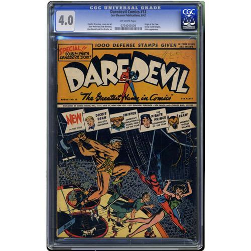 <B>Daredevil Comics #12 (Lev Gleason, 1942) CGC VG 4.0 Off-white pages.</B></I> Origin of the Claw retold. First installment of the Scoop Scuttle backup feature by Basil Wolverton. Hitler appearance. Bob Montana and Dick Briefer art. Charles Biro cover. Overstreet 2006 VG 4.0 value = $286. CGC census 2/06: 1 in 4.0, 5 higher. <I>From the Collection of Harold Curtis.</B></I>