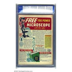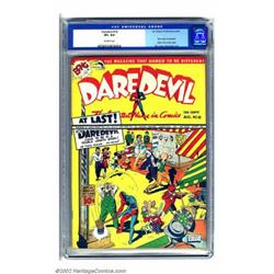 Daredevil Comics #18 (Lev Gleason, 1943) CGC VF+ 8.5 Off-white pages. One of the more colorful and unusual Charles Biro covers in Daredevil features likenesses of Hitler, Mussolini, Tojo, and---get this--Mickey Mouse! We are not kidding! You can see Mickey resting in front of the booth after a hard day at the studio. Daredevil's origin, first told in Silver Streak Comics #6, is revamped in this issue to match the new vision for the character. This beautiful comic has the look of a pedigree, with its bright, carnival colors and sturdy spine. CGC hasn't seen a better copy of issue #18 and neither have we. Overstreet 2002 VF 8.0 value = $795. Important notice: We expect to be auctioning lots at the rate of 200-250 per hour. Sometimes eBay Premier live bid software cannot keep up with that pace, so we strongly recommend that you place a realistic proxy bid now as insurance to avoid disappointment. Also please note that all Heritage/CAA lots purchased through eBay Premier carry a 20% Buyer's Premium. Please make sure you read the Terms and Conditions.