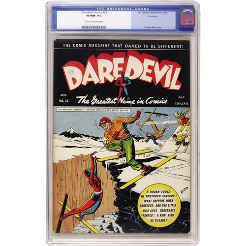 <B>Daredevil Comics #23 Rockford pedigree (Lev Gleason, 1944) CGC VF/NM 9.0 Cream to off-white pages.</B></I> The villain of the piece is not ""Psycho,"" but P<I>shy</B></I>co... well, he's a bit of a psycho, too. Charles Biro drew the cover. A very sharp copy of a black-cover issue. Overstreet 2006 VF/NM 9.0 value = $382; NM- 9.2 value = $520. CGC census 3/07: 1 in 9.0, 1 higher.<BR><BR><b>Shipping:</b> Comics - Slabbed (certified) (<a target=""_blank"" href=""http://www.heritageauctions.com/common/shipping.php"">view shipping information</a>)