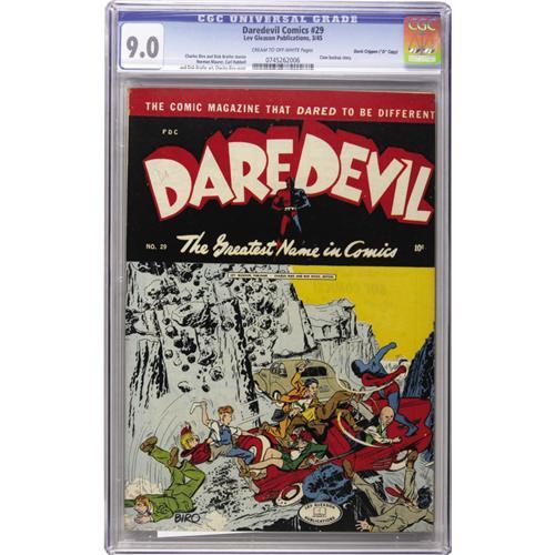 <B>Daredevil Comics #29 Davis Crippen ("D" Copy) pedigree (Lev Gleason, 1945) CGC VF/NM 9.0 Cream to off-white pages.</B></I> Zoom in on the scan on our website if you want to enjoy all of the intricate detail on this Charles Biro cover. Or just make sure you're the winning bidder! Overstreet 2006 VF/NM 9.0 value = $382; NM- 9.2 value = $520. CGC census 11/06: 1 in 9.0, 2 higher. <I>From the Crippen Collection.</B></I><BR><BR><b>Shipping:</b> Slabbed Comic (<a target="_blank" href="http://www.heritageauctions.com/common/shipping.php">view shipping information</a>)