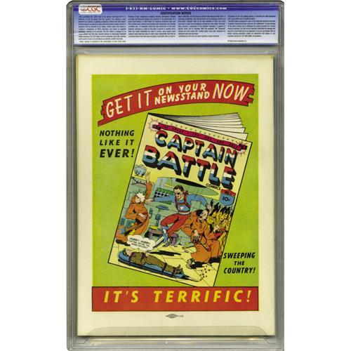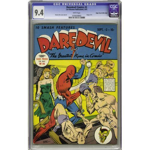 <B>Daredevil Comics #3 Mile High pedigree (Lev Gleason, 1941) CGC NM 9.4 White pages.</B></I> The mighty Daredevil makes short work of several bad guys, while saving a beautiful woman, on this action-packed cover by Charles Biro. The origin of Thirteen is revealed inside. Tied with one other copy for highest-graded of this issue by CGC to date. CGC's census report lists no other nicer than VF- 7.5. Overstreet 2006 NM- 9.2 value = $2,800. CGC census 5/06: 2 in 9.4, none higher. <BR><BR><B>Important notice:</B> Heritage usually auctions material at the rate of 200-250 lots per hour. On some occasions eBay Live bid software or the Internet may not be able to keep up with the pace of the auction. We recommend placing a realistic absentee bid now as insurance to avoid disappointment. Occasionally the auctioneer may eliminate or reject an eBay Live bid, and the auctioneer may also reopen a lot after the close of the eBay live bidding (usually because we missed an audience bid), and may reject your bid even if it shows you as the winning bidder. By bidding via eBay Live, you agree that Heritage may award the lot to another bidder at its sole discretion under the circumstances described above or any other reasonable circumstances. Since eBay bids are not shown to us until we open the lot on the floor, we treat those bids just like floor bids. In most cases the floor responds before the eBay bid is presented to us, due to Internet lag time, so for consistency we have made it a policy that floor bids are always considered first over tie eBay live bids. Also please note that all Heritage lots purchased through eBay Live carry a 22.5% Buyer's Premium. Please make sure you read the Terms and Conditions before you bid. This lot is being auctioned in conjunction with a live floor auction by Heritage Auction Galleries. All final auction and invoice information will be supplied by Heritage Auction Galleries, and all other information should be considered preliminary. Lot:41001 <BR><BR><B>Winning Notification and Billing:</B> After the FINAL session in this auction is complete, Heritage will send e-mail and snail mail invoices. This process normally takes several days. All final auction and invoice information will be supplied by Heritage Auction Galleries, and all other information should be considered preliminary. <BR><BR>This auction will be conducted on a live auction floor and over the Internet through eBay Live. If you choose to place an absentee bid, please take a moment to <font color='#0000ff'><u><a href='http://pages.ebay.com/liveauctions/help/before/laabsentee.html'>learn how eBay Live absentee bidding works</a></u></font><font color='#000000'>