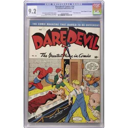 <B>Daredevil Comics #30 Davis Crippen ("D" Copy) pedigree (Lev Gleason, 1945) CGC NM- 9.2 Cream to off-white pages.</B></I> Charles Biro drew this issue's cover and contributed his writing skills to the Daredevil story. There's also Dick Briefer art in these pages. No copy has been graded higher by CGC to date. Overstreet 2006 NM- 9.2 value = $520. CGC census 9/06: 1 in 9.2, none higher. <I>From the Crippen Collection</B></I>.<BR><BR><b>Shipping:</b> Slabbed Comic (<a target="_blank" href="http://www.heritageauctions.com/common/shipping.php">view shipping information</a>)