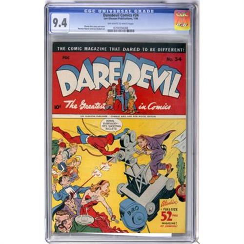 <B>Daredevil Comics #34 (Lev Gleason, 1946) CGC NM 9.4 Off-white to white pages.</B></I> Charles Biro story and cover. Norman Maurer art. Overstreet 2007 NM- 9.2 value = $375. CGC census 6/07: 1 in 9.4, none higher.<BR><BR><b>Shipping:</b> Comics - Slabbed (certified) (<a target="_blank" href="http://www.heritageauctions.com/common/shipping.php">view shipping information</a>)