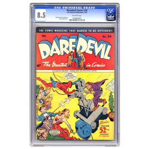 <B>Daredevil Comics #34 (Lev Gleason, 1946) CGC VF+ 8.5 Off-white pages.</B></I> Charles Biro cover. Overstreet 2006 VF 8.0 value = $178; VF/NM 9.0 value = $264. CGC census 3/06: 2 in 8.5, 4 higher.
