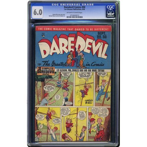 <B>Daredevil Comics #50 (Lev Gleason, 1948) CGC FN 6.0 Off-white to white pages.</B></I> Charles Biro cover. Overstreet 2006 FN 6.0 value = $78. CGC census 2/06: 1 in 6.0, 1 higher. <I>From the Collection of Harold Curtis.</B></I>