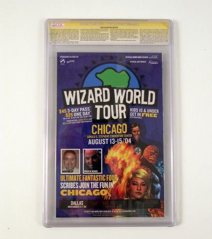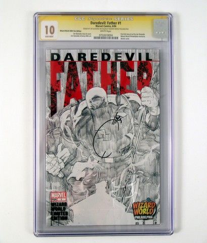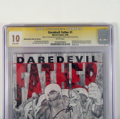 This "Daredevil Father" Marvel comic book is rated CGC 10, the perfect comic book! It also happens to be a CGC witnessed signed edition. Signed on the front cover by Joe Quesada, it contains such highlights as the awesome artwork and writing of Joe Quesada, as well as being the Wizard World Philadelphia sketch variant cover! Signed by Quesada on May 22, 2004 at Wizard World in Philadelphia. Still in its original plastic protective cover with the hologram CGC Certificate and Rating.