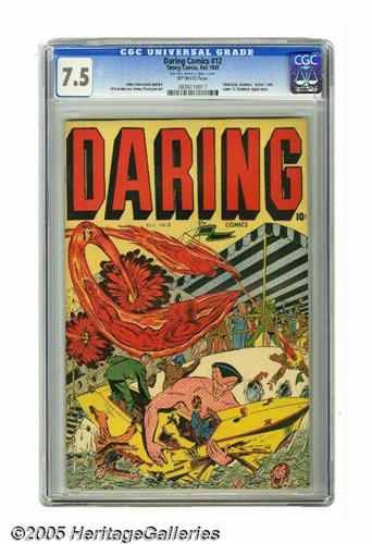 <B>Daring Comics #12 (Timely, 1945) CGC VF- 7.5 Off-white pages.</B></I> The final issue of the title featured an Allen Simon cover and an appearance by the Destroyer. CGC notes, "Very minor amount of glue on cover." Overstreet 2005 VF 8.0 value = $663. CGC census 7/05: 1 in 7.5, 5 higher.