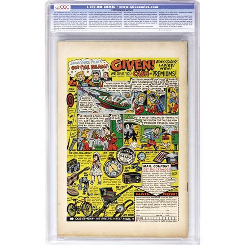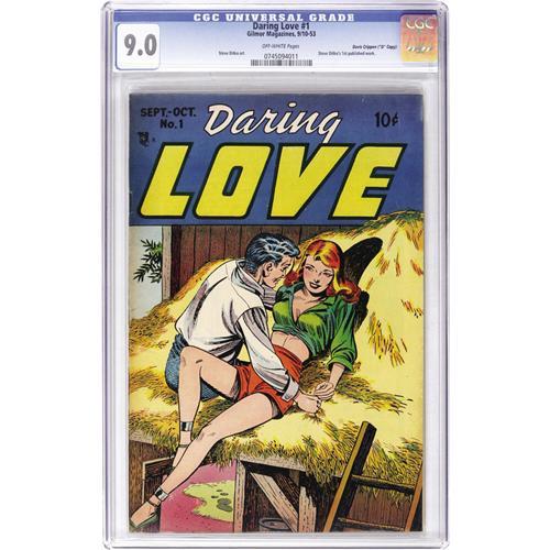 <B>Daring Love #1 Davis Crippen ("D" Copy) pedigree (Gillmor, 1953) CGC VF/NM 9.0 Off-white pages.</B></I> Steve Ditko's first <I>published</B></I> comics work was in this book! It's the only issue of the title before it changed to <B>Radiant Love</B></I> with issue #2. Overstreet calls it "scarce" and Gerber's Scarcity Index lists it as a "6", or "uncommon." Overstreet 2006 VF/NM 9.0 value = $515; NM- 9.2 value = $700. CGC census 7/06: 1 in 9.0, none higher. <I>From the Crippen Collection.</B></I> <BR><BR><B>Important notice:</B> Heritage usually auctions material at the rate of 200-250 lots per hour. On some occasions eBay Live bid software or the Internet may not be able to keep up with the pace of the auction. We recommend placing a realistic absentee bid now as insurance to avoid disappointment. Occasionally the auctioneer may eliminate or reject an eBay Live bid, and the auctioneer may also reopen a lot after the close of the eBay live bidding (usually because we missed an audience bid), and may reject your bid even if it shows you as the winning bidder. By bidding via eBay Live, you agree that Heritage may award the lot to another bidder at its sole discretion under the circumstances described above or any other reasonable circumstances. Since eBay bids are not shown to us until we open the lot on the floor, we treat those bids just like floor bids. In most cases the floor responds before the eBay bid is presented to us, due to Internet lag time, so for consistency we have made it a policy that floor bids are always considered first over tie eBay live bids. Also please note that all Heritage lots purchased through eBay Live carry a 22.5% Buyer's Premium. Please make sure you read the Terms and Conditions before you bid. This lot is being auctioned in conjunction with a live floor auction by Heritage Auction Galleries. All final auction and invoice information will be supplied by Heritage Auction Galleries, and all other information should be considered preliminary. Lot:41001 <BR><BR><B>Winning Notification and Billing:</B> After the FINAL session in this auction is complete, Heritage will send e-mail and snail mail invoices. This process normally takes several days. All final auction and invoice information will be supplied by Heritage Auction Galleries, and all other information should be considered preliminary. <BR><BR>This auction will be conducted on a live auction floor and over the Internet through eBay Live. If you choose to place an absentee bid, please take a moment to <font color='#0000ff'><u><a href='http://pages.ebay.com/liveauctions/help/before/laabsentee.html'>learn how eBay Live absentee bidding works</a></u></font><font color='#000000'>