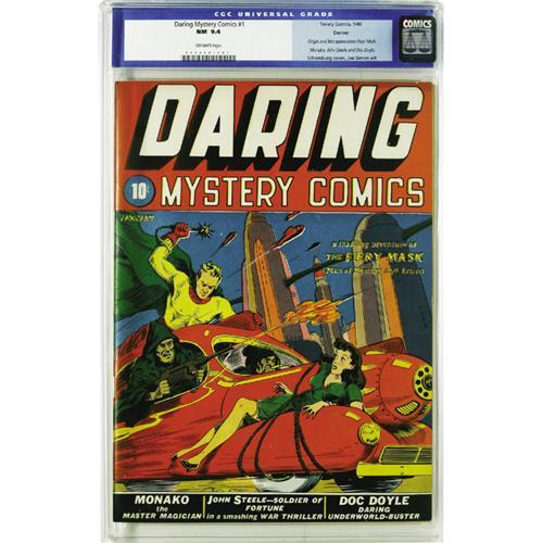 <B>Daring Mystery Comics #1 Denver pedigree Timely, 1940) CGC NM 9.4 Off-white pages.</B></I> This milestone Timely hit the newsstands just three months after <B>Marvel Comics</B></I> #1, and well before first issues of better-known titles such as <B>Human Torch Comics</B></I> and <B>Sub-Mariner Comics</B></I>. The cover is quintessential Alex Schomburg -- bondage, hooded bad guys, and action galore. The futuristic theme featured the Fiery Mask, a character whose origin and first appearance could be found inside. This brilliant Denver pedigree copy could have come from the "other" premier pedigree from Colorado -- it is magnificent! The issue itself is Gerber "scarce", underscored by the total number of unrestored copies CGC has certified to date, a mere five. And, no other copy has been graded nicer than FN 6.0! Joe Simon contributed interior art. Overstreet 2006 NM- 9.2 value = $33,000. CGC census 03/06: 1 in 9.4, none higher.