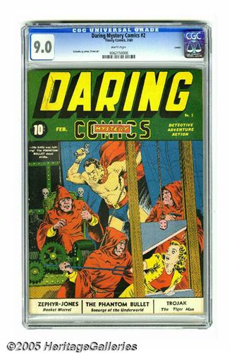 <B>Daring Mystery Comics #2 Larson pedigree (Timely, 1940) CGC VF/NM 9.0 White pages.</B></I> This is the highest-graded copy of this issue, and the only one to be certified above VF- as of this writing. The issue is termed "rare" by both Gerber and Overstreet. The book's got a cover by the masterful Alex Schomburg and interior art by Joe Simon. And our offering is from one of the more famous pedigree collections, namely that of Nebraska-based Lamont Larson. Though we've got oodles of great Timely books in this catalog, this lot would have to stand as one of the gems of the sale! Overstreet 2005 VF/NM 9.0 value = $11,250; NM- 9.2 value = $15,500. CGC census 7/05: 1 in 9.0, none higher.
