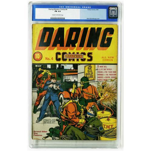 <B>Daring Mystery Comics #4 (Timely, 1940) CGC FN 6.0 Cream to off-white pages.</B></I> This was the only non-superhero cover of this title's run, and it features exciting art by Alex Schomburg. Unlike the other Timely titles, this series had a different lineup of characters in almost every issue. The Ace G-Man got top billing here. A mere two copies of this issue have been certified with higher grades by CGC to date. Overstreet 2005 FN 6.0 value = $993. CGC census 11/05: 1 in 6.0, 2 higher.