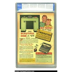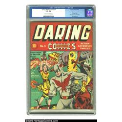 Daring Mystery Comics #5 (Timely, 1940) CGC VF- 7.5 Off-white to white pages. The Falcon makes his first appearance on this bondage cover. One other copy of this issue, at Very Fine, edges the one you see here for the top-ranked spot in CGC's most recent census. The most obvious imperfections include some stress marks along the spine and dust shadowing on the back cover. Joe Simon helps out with interior art. Overstreet 2002 VF 8.0 value = $1,875. Important notice: We expect to be auctioning lots at the rate of 200-250 per hour. Sometimes eBay Premier live bid software cannot keep up with that pace, so we strongly recommend that you place a realistic proxy bid now as insurance to avoid disappointment. Also please note that all Heritage/CAA lots purchased through eBay Premier carry a 20% Buyer's Premium. Please make sure you read the Terms and Conditions.