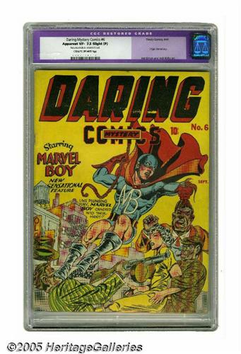 <B>Daring Mystery Comics #6 (Timely, 1940) CGC Apparent VF- 7.5 Slight (P) Cream to off-white pages.</B></I> The Simon and Kirby team put their stamp on this issue, drawing the cover and writing and illustrating two stories, one introducing Marvel Boy (not the same character who briefly had his own series) and another featuring the Fiery Mask. CGC notes, "Restoration includes: cover reinforced." Overstreet 2005 GD 2.0 value = $423; VG 4.0 value = $846; FN 6.0 value = $1,269; VF 8.0 value = $2,790.