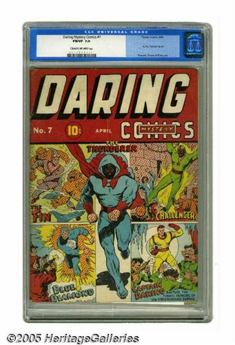 <B>Daring Mystery Comics #7 (Timely, 1941) CGC FN/VF 7.0 Cream to off-white pages.</B></I> Timelys from this period are sought after in most any grade, and this issue has the advantage of art by the Simon and Kirby team. Also of note is the work of Bill Everett, no stranger to aquatic characters, who drew the adventure of the Fin. Overstreet 2005 FN 6.0 value = $1,035; VF 8.0 value = $2,243. CGC census 6/05: 1 in 7.0, 2 higher.