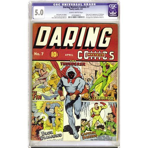 <B>Daring Mystery Comics #7 (Timely, 1941) CGC VG/FN 5.0 Slightly brittle pages.</B></I> This series got a fresh start with a brand-new cast of characters in this issue. Making their first appearances were Captain Daring (by Simon and Kirby) the Challenger, the Silver Scorpion, the Blue Diamond, the Thunderer (by Carl Burgos), the Fin (by Bill Everett), and more. Overstreet credits the cover to Alex Schomburg. Overstreet 2006 VG 4.0 value = $696; FN 6.0 value = $1,044. CGC census 6/06: 1 in 5.0, 6 higher. <BR><BR><B>Important notice:</B> Heritage usually auctions material at the rate of 200-250 lots per hour. On some occasions eBay Live bid software or the Internet may not be able to keep up with the pace of the auction. We recommend placing a realistic absentee bid now as insurance to avoid disappointment. Occasionally the auctioneer may eliminate or reject an eBay Live bid, and the auctioneer may also reopen a lot after the close of the eBay live bidding (usually because we missed an audience bid), and may reject your bid even if it shows you as the winning bidder. By bidding via eBay Live, you agree that Heritage may award the lot to another bidder at its sole discretion under the circumstances described above or any other reasonable circumstances. Since eBay bids are not shown to us until we open the lot on the floor, we treat those bids just like floor bids. In most cases the floor responds before the eBay bid is presented to us, due to Internet lag time, so for consistency we have made it a policy that floor bids are always considered first over tie eBay live bids. Also please note that all Heritage lots purchased through eBay Live carry a 22.5% Buyer's Premium. Please make sure you read the Terms and Conditions before you bid. This lot is being auctioned in conjunction with a live floor auction by Heritage Auction Galleries. All final auction and invoice information will be supplied by Heritage Auction Galleries, and all other information should be considered preliminary. Lot:41001 <BR><BR><B>Winning Notification and Billing:</B> After the FINAL session in this auction is complete, Heritage will send e-mail and snail mail invoices. This process normally takes several days. All final auction and invoice information will be supplied by Heritage Auction Galleries, and all other information should be considered preliminary. <BR><BR>This auction will be conducted on a live auction floor and over the Internet through eBay Live. If you choose to place an absentee bid, please take a moment to <font color='#0000ff'><u><a href='http://pages.ebay.com/liveauctions/help/before/laabsentee.html'>learn how eBay Live absentee bidding works</a></u></font><font color='#000000'>