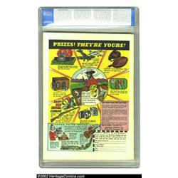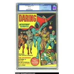 Daring Mystery Comics #8 (Timely, 1942) CGC VF 8.0 Off-white pages. Just two unrestored copies of this issue, which would become Daring Comics with issue #9, have been certified by CGC to date. The other copy is far less well-preserved, at Very Good Plus. The front cover is very clean and bright, with minimal defects limited primarily to some scuffing along the spine. The white borders of the back cover are less forgiving, displaying more readily the few defects keeping the book below Near Mint territory. Overstreet 2002 VF 8.0 value = $1,705. Important notice: We expect to be auctioning lots at the rate of 200-250 per hour. Sometimes eBay Premier live bid software cannot keep up with that pace, so we strongly recommend that you place a realistic proxy bid now as insurance to avoid disappointment. Also please note that all Heritage/CAA lots purchased through eBay Premier carry a 20% Buyer's Premium. Please make sure you read the Terms and Conditions.