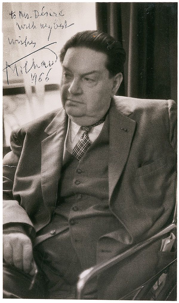 Distinguished and prolific French composer (1892–1974) best known for his pioneering incorporation of jazz elements and polytonality in such repertoire staples as ‘Le boeuf sur le toit’ and ‘La création du monde.’ Glossy 4 x 7 photo, signed and inscribed in black ballpoint “To Ms. Desire, with my best wishes, Milhaud 1966.” In very good condition, with lightly trimmed edges, scattered light surface marks and impressions and some light skipping to signature.