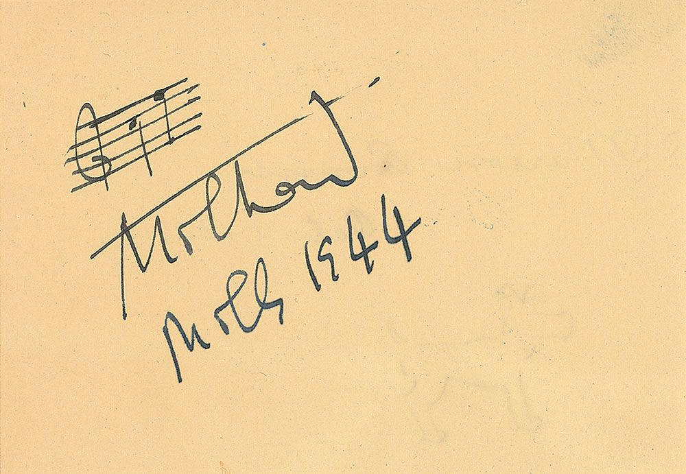 Distinguished and prolific French composer (1892–1974) best known for his pioneering incorporation of jazz elements and polytonality in such repertoire staples as ‘Le boeuf sur le toit’ and ‘La création du monde.’ AMQS on an off-white 4.75 x 3.5 album page. Milhaud pens two notes of music, signed below, “Milhaud,” and dated 1944. In fine condition.