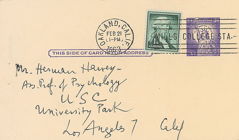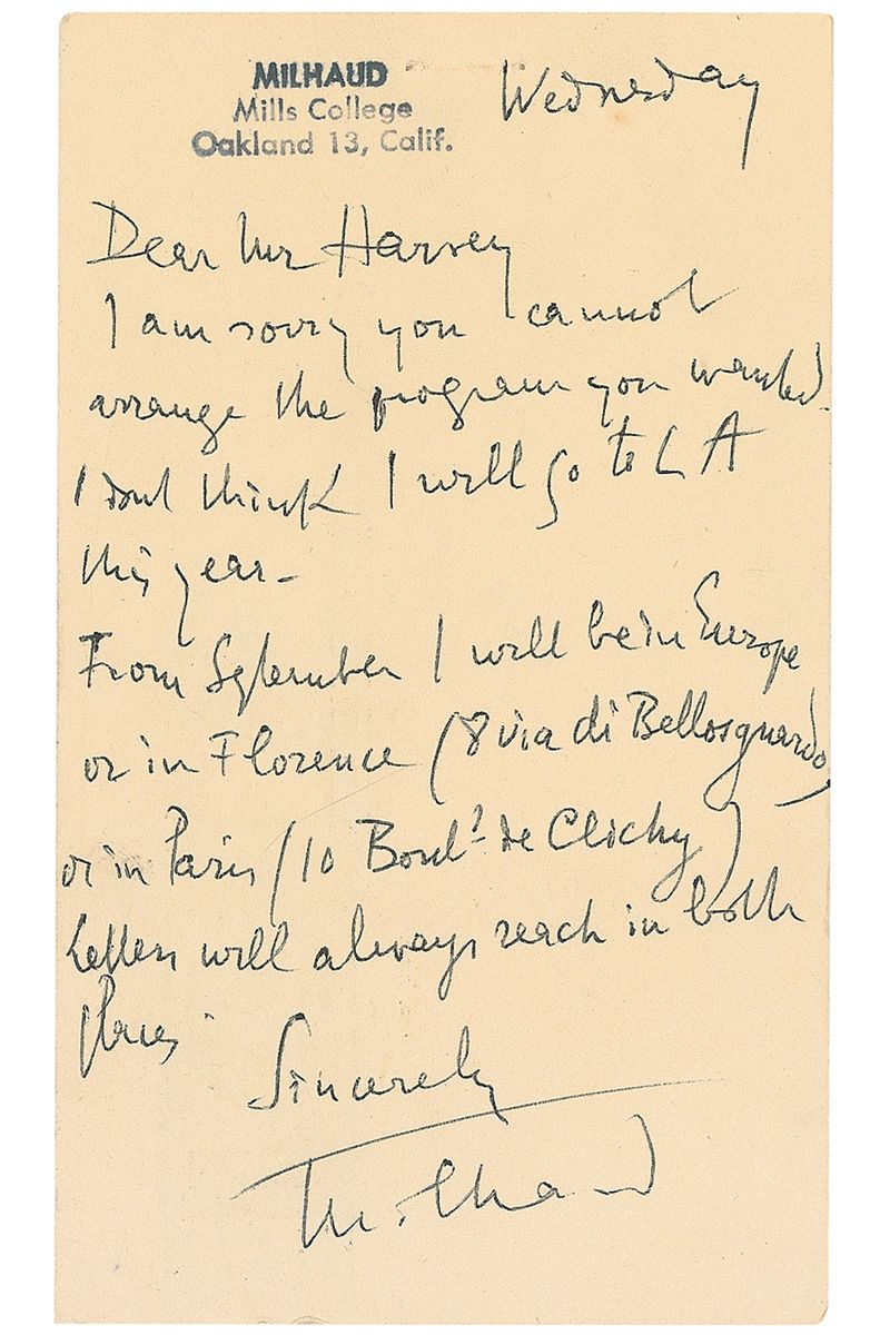 Distinguished and prolific French composer (1892–1974) best known for his pioneering incorporation of jazz elements and polytonality in such repertoire staples as ‘Le boeuf sur le toit’ and ‘La création du monde.’ ALS signed “Milhaud,” one page on a postcard, 3.25 x 5.5, stamped personal letterhead, postmarked February 21, 1963. Letter to Herman Harvey. In part: “I am sorry you cannot arrange the program you wanted. I don’t think I will go to LA this year.” Reverse is also addressed in Milhaud’s hand. Light scattered creases and staple holes to the upper border, otherwise fine condition.